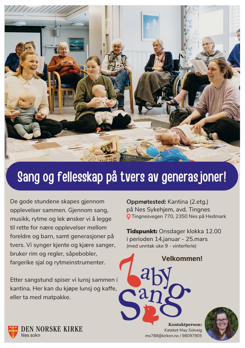Fra vår store sangskatt henter vi frem både tradisjonelle og nyere sanger. Vi samles på matter og får utdelt sanghefte og rytmeinstrument. Vi synger flere kjente og kjære barnesanger, navnesanger, salmer, rim og regler. Vi bruker mye bevegelser og noe dans. På noen sanger har vi med oss en høyttaler, men stemmen er det viktigste vi har med oss. For å delta kreves det ingen sangkvalifikasjoner eller gode terningkast fra musikkanmeldere. For ditt barn er din stemme den viktigste og vakreste uansett. Babysang passer best for babyer mellom 2 til 12 måneder, sammen med foresatt/mor, far eller annen omsorgsperson. Etter sangstund er det mulig å spise lunsj i kirka, ta med egen matpakke også holder vi drikke og frukt.